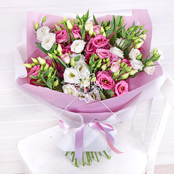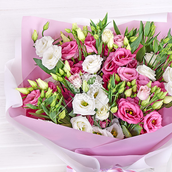 Эти бесподобные цветы  имеют несколько названий – эустома, лизиантус, а еще - ирландская роза. Цветы действительно имеют сходство с розой, выглядят очень привлекательно и заманчиво! В этом букете они представлены в двух оттенках – розовом и белом. В такой цветовой гамме композиция выглядит гармонично и красиво!
