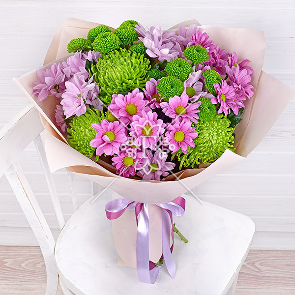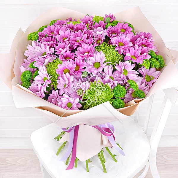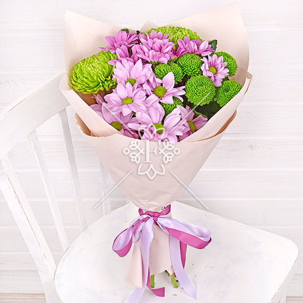 Здесь идеально сочетаются прекрасные хризантемы двух цветов – фиолетовые ромашковидные, которые придают этой композиции очарование и нежность, зеленые одноголовые и зеленые кустовые, которые дарят яркость и свежесть!