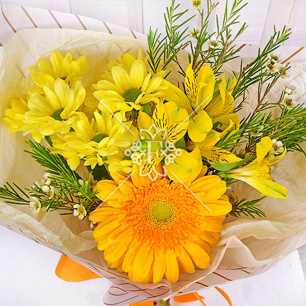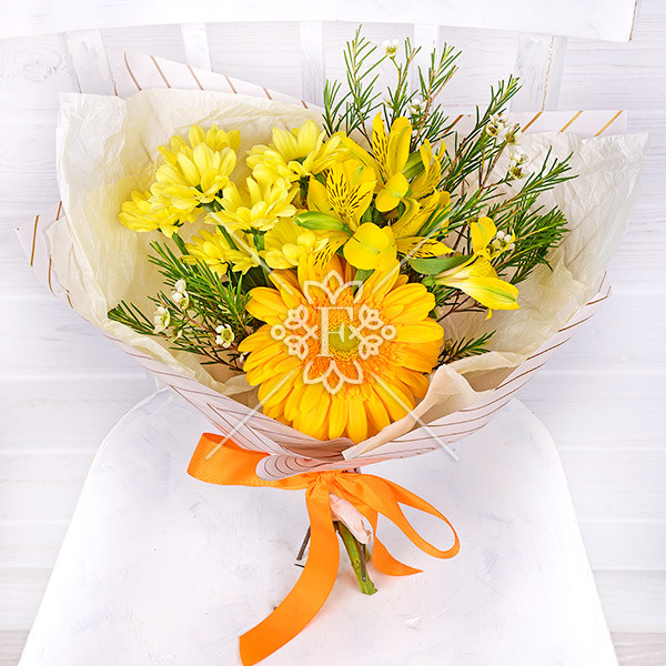 Гербера желтая – 1 шт., альстромерия желтая – 1 шт., хризантема желтая  - 1 шт.,хамелациум – 1 шт., упаковка, лента.
