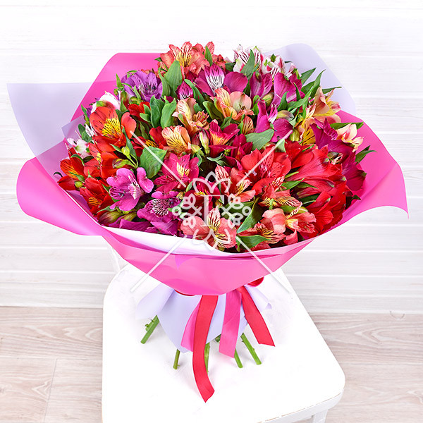 альстромерия разноцветная (красная, розовая, фиолетовая) – 7 шт., упаковка, лента.