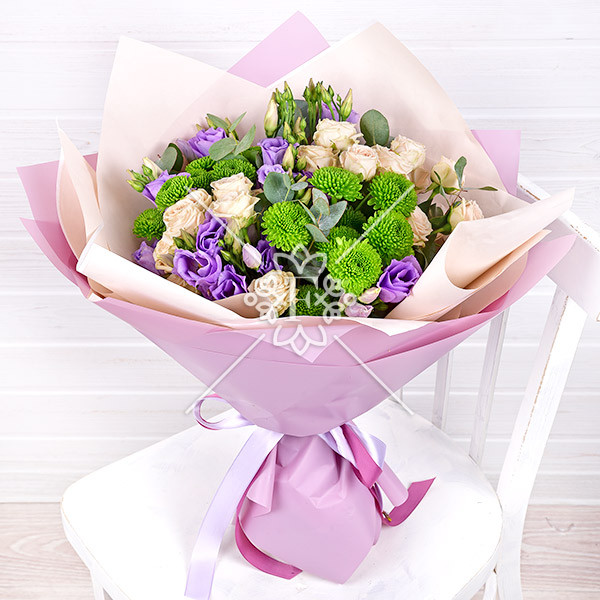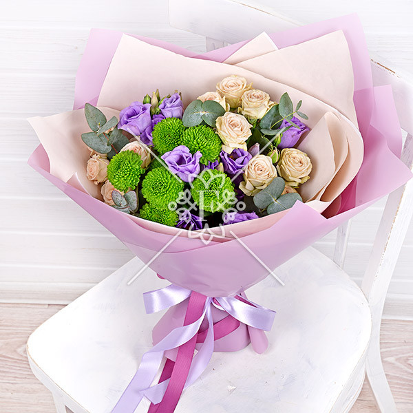 Здесь сочетаются нежная и очаровательно-воздушная фиолетовая эустома, легкая и пышная кустовая роза кремового оттенка, необыкновенная и обворожительная кустовая хризантема насыщенно-зеленого цвета. Дополняют цветочную композицию, подчеркивая ее совершенство, зелень фисташки и эвкалипта.